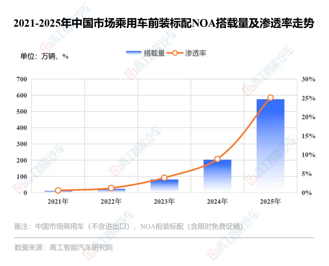 高工智能汽车研究院报告提到,过去五年NOA功能从初期“尝鲜配置”快速走向规模化普及,前装标配车型年交付量从11.8万辆跃升至576.7万辆,渗透率从不足1%提升至25.1%,年复合增长率高达164.4%。
